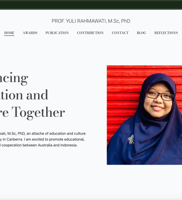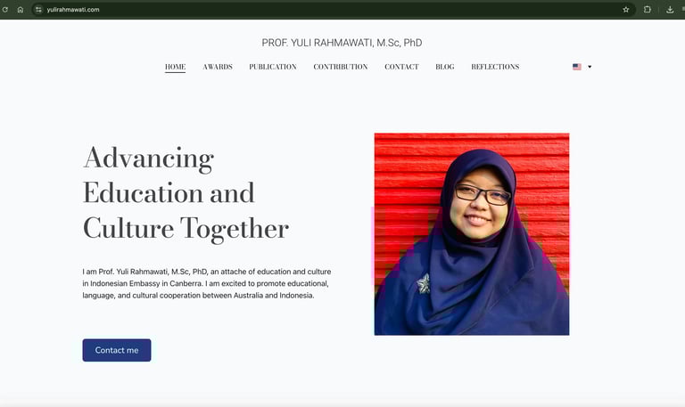 A professional website for Prof. Yuli Rahmawati, MSc, PhD, designed to highlight academic work, cultural programs, and international partnerships between the two nations.